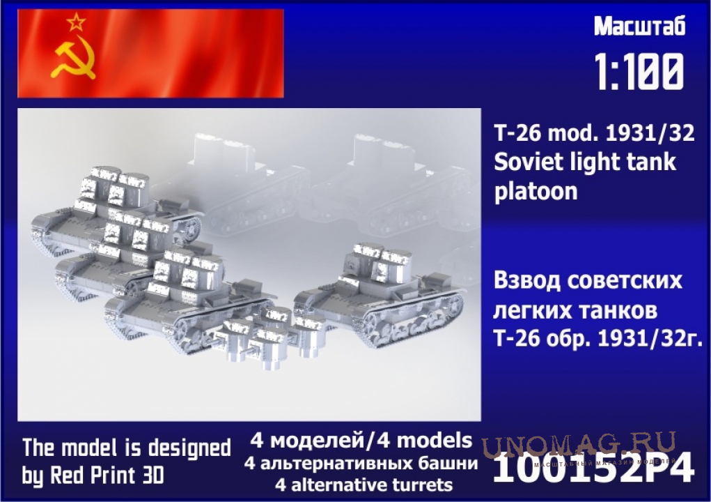 В набор входят 4 модель танка Т-26 образца 1931-го года и четыре пушечных башни образца 1932-го года.