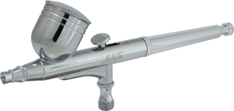 Простой и надежный аэрограф Jas 1113. Отличный вариант попробовать свои силы в аэрографии. Двойного независимое действие, верхняя подача, емкость бачка 7мл, сопло 0.3мм. Для любых видов работ.