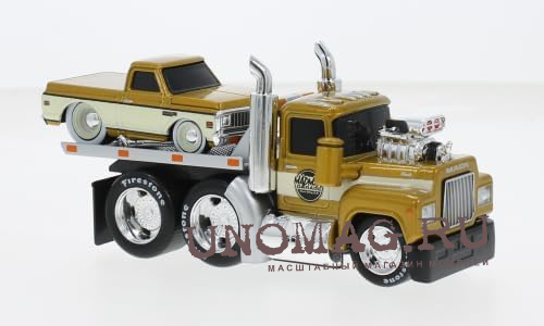 MACK R685st Flatbed Truck Car Transporter With CHEVROLET C-10 Pick-up Custom (1972), Gold White