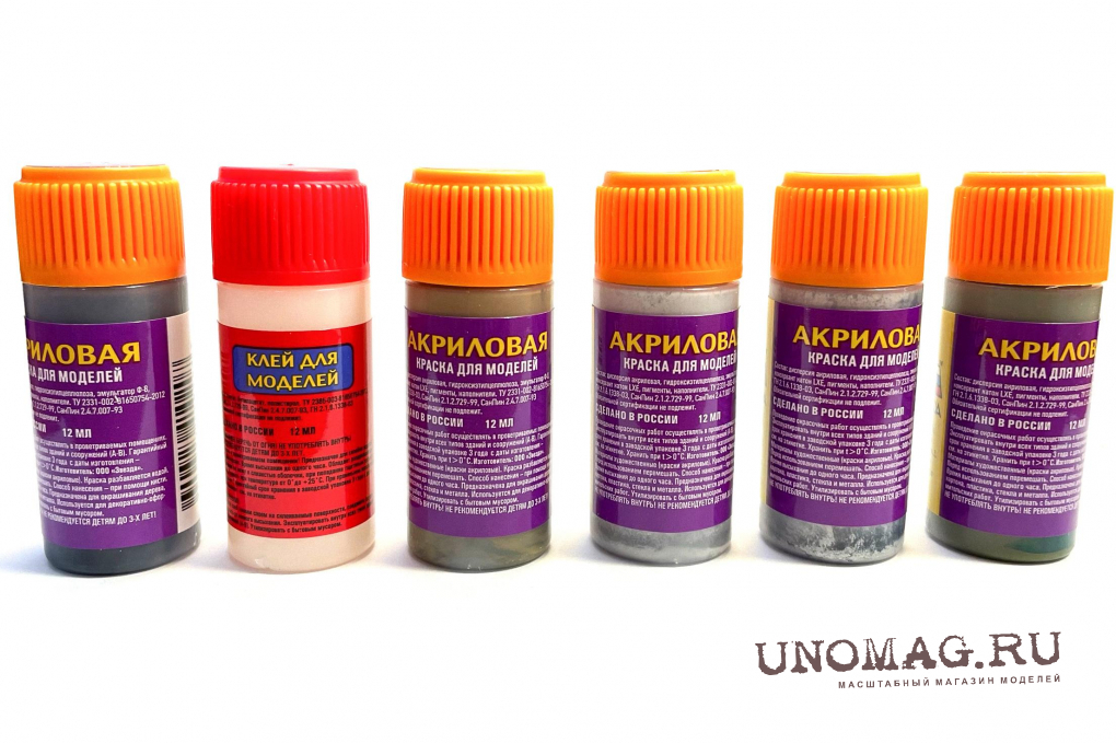 Набор состоит из 5 основных цветов акриловых красок и клея для окрашивания сборных моделей гражданской авиации СССР/России. В комплект входят краски: 05, 06, 20, 39 и 55
