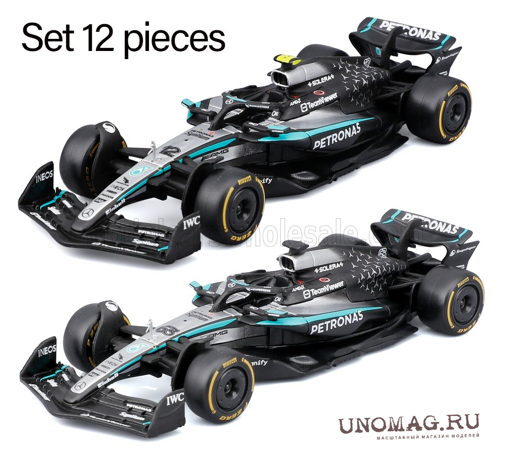 MERCEDES GP F1 - Set 12x - Espositore - Display Stand - W16 Team Amg Petronas Motorsport №12 Season 2025 Andrea Kimi Antonelli + №63 George Russell, Black Silver Green