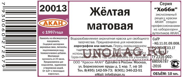 Краска желтая, акриловая (12 мл.)