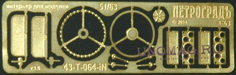 Набор в дополнение к 43-T-064 с интерьером кабины 51/63, в составе: панели приборов, солнцезвщитные козырьки ("откинутый" и "поднятый"), имитация рулевого колеса; латунь