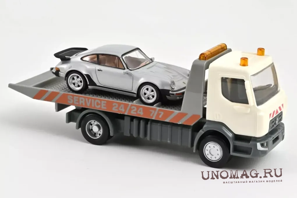 RENAULT Carro Attrezzi Truck Car Transporter With Porsche 911 930 3.0 Turbo Coupe (1987), White Silver