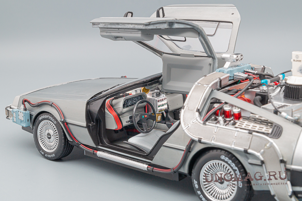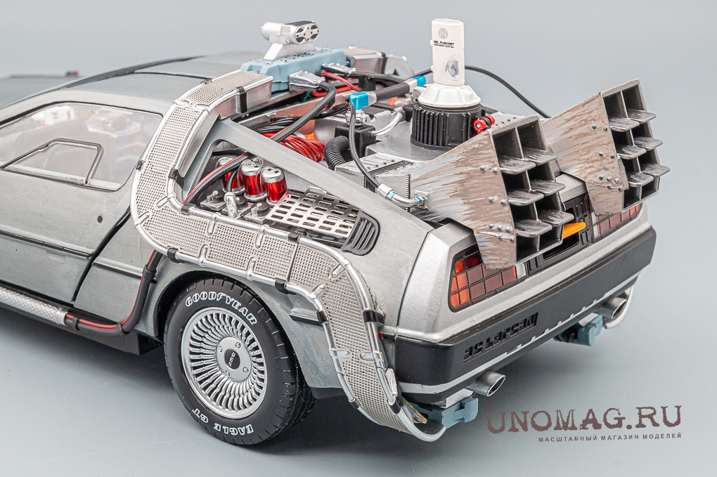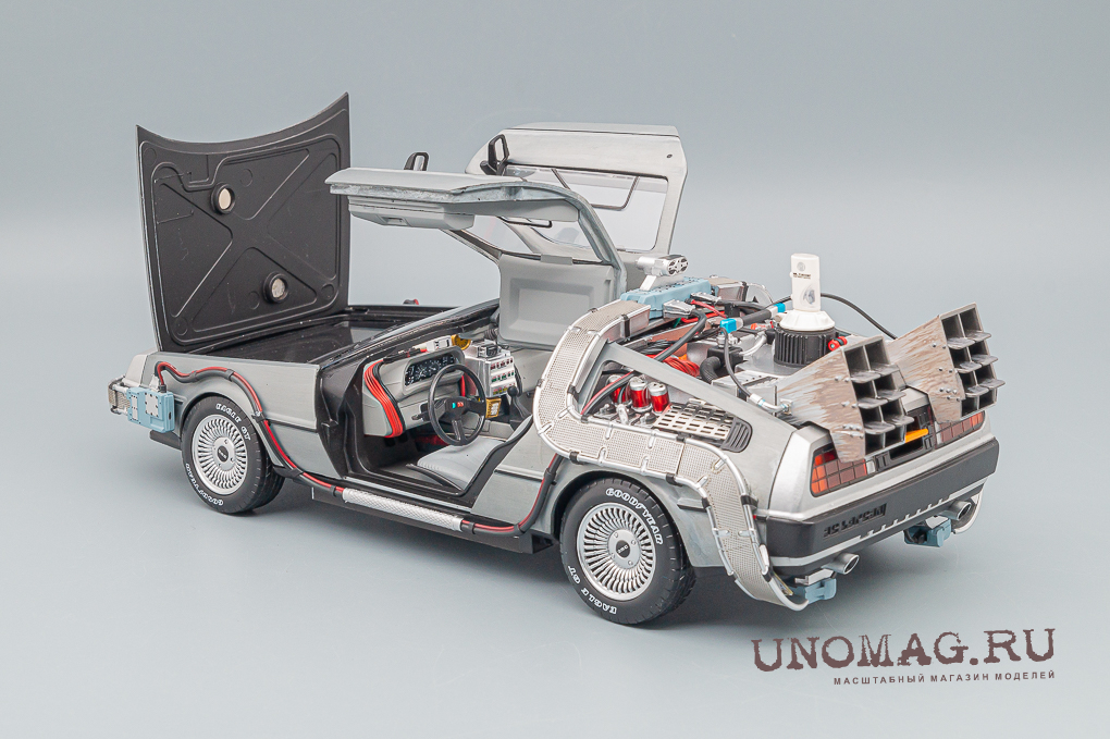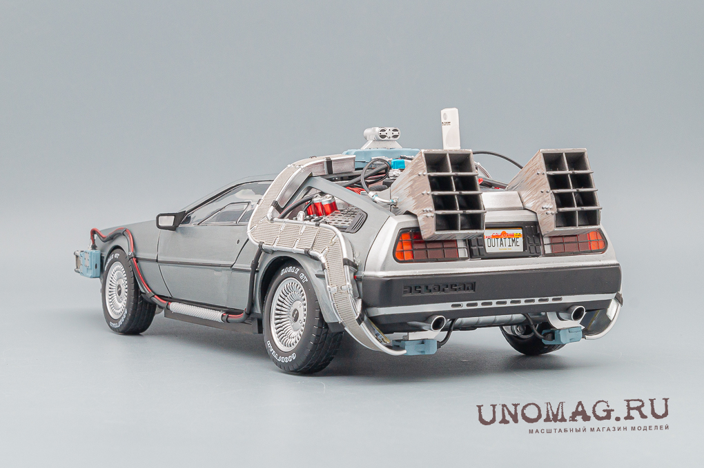 Это детально проработанное издание модели DeLOREAN DMC-12 Time Machine, Back to the Future Ultimate Edition, включающее взаимозаменяемые детали, воссоздает все пять версий Машины времени из трилогии "Назад в будущее".