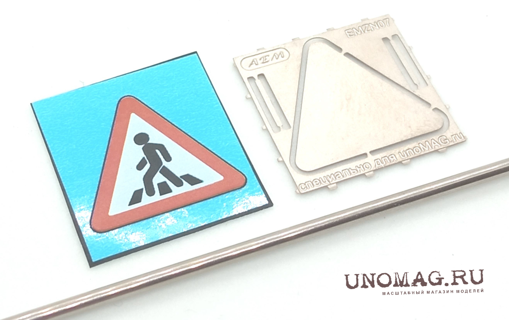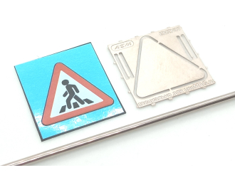 Комплект деталей для сборки дорожного знака. В состав набора входят - металлическая подложка (фототравление), декаль с изображением знака, металлическая полая трубка (столб), хомуты крепления с имитацией болтов (фототравление).