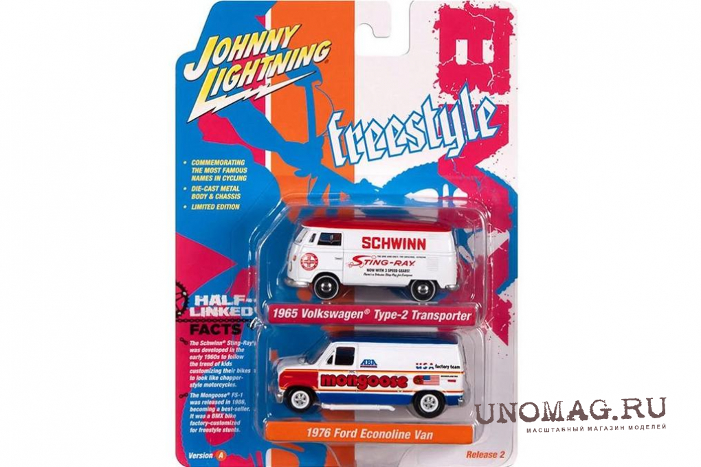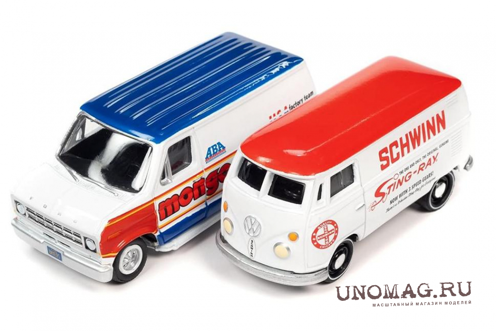 VOLKSWAGEN Type-2 Transporter (1965) white/red + FORD Econoline Van (1976), white/blue