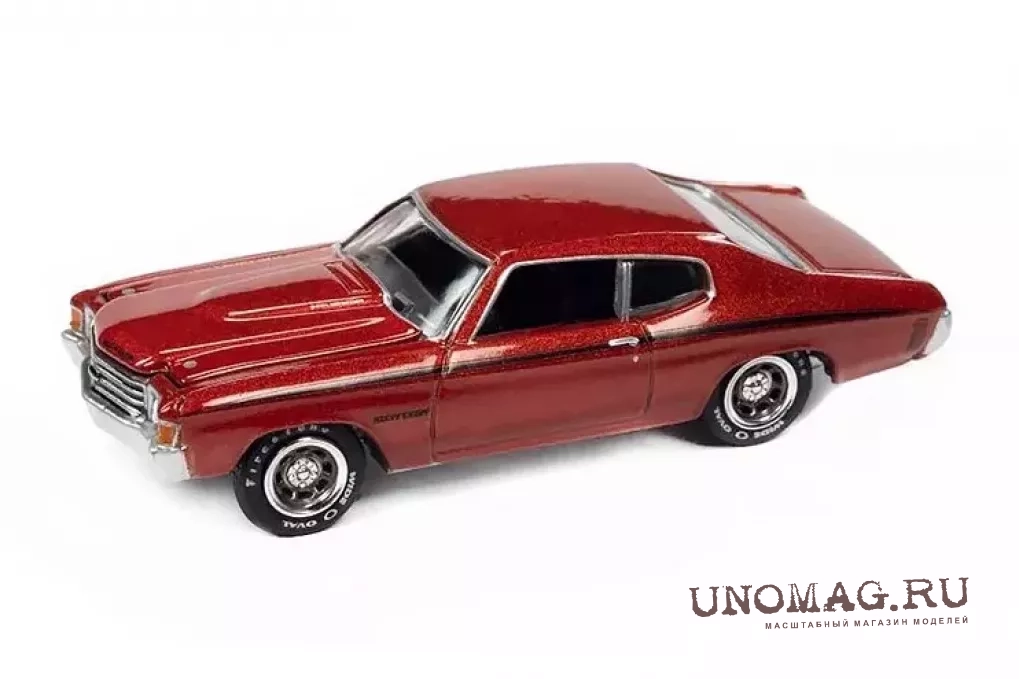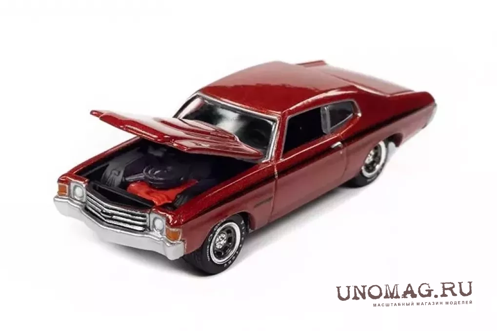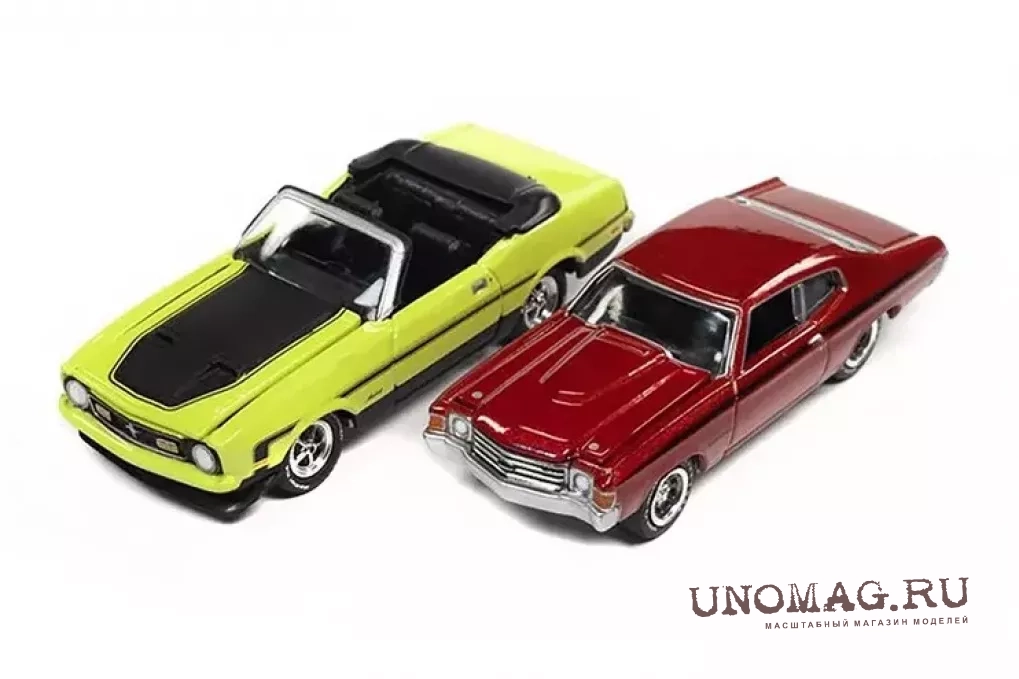 1:64 Ford Mustang Convertible(1972), Dark Green Poly/silver, Chevrolet Chevelle SS Heavy Chevrolet, Fathom Blue with Heavy Chevy Emblem & White Side Stripe