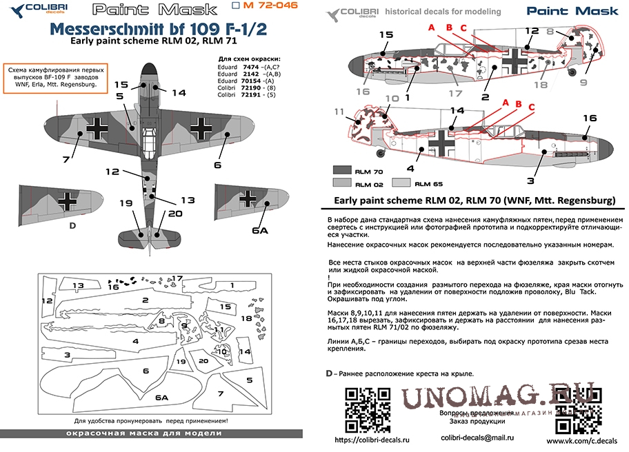 Маска окрасочная Bf 109 F-1/2 (Early paint scheme WNF, Mtt. Regensburg)