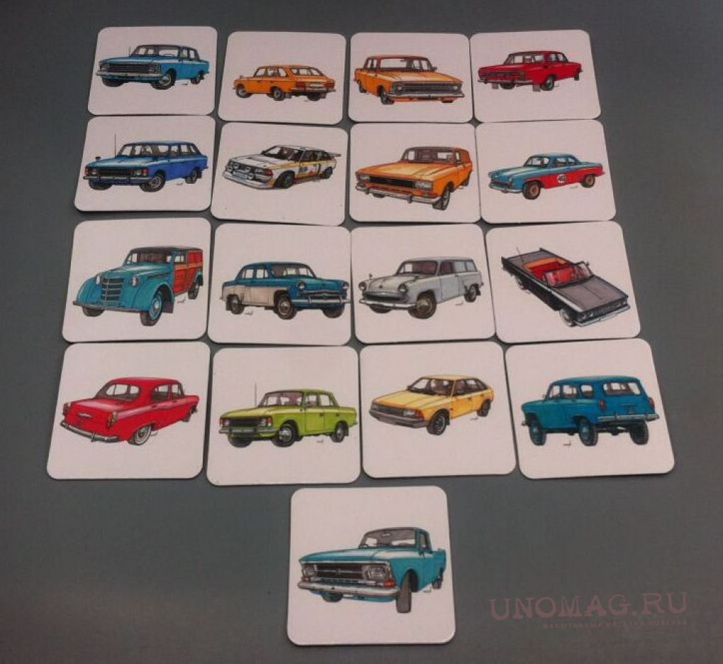 Набор из семнадцати магнитов с рисунками отечественных автомобилей.