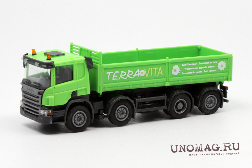 SCANIA P 8х2 самосвал с стальными бортами для перевозки торфа, салатовый/салатовый