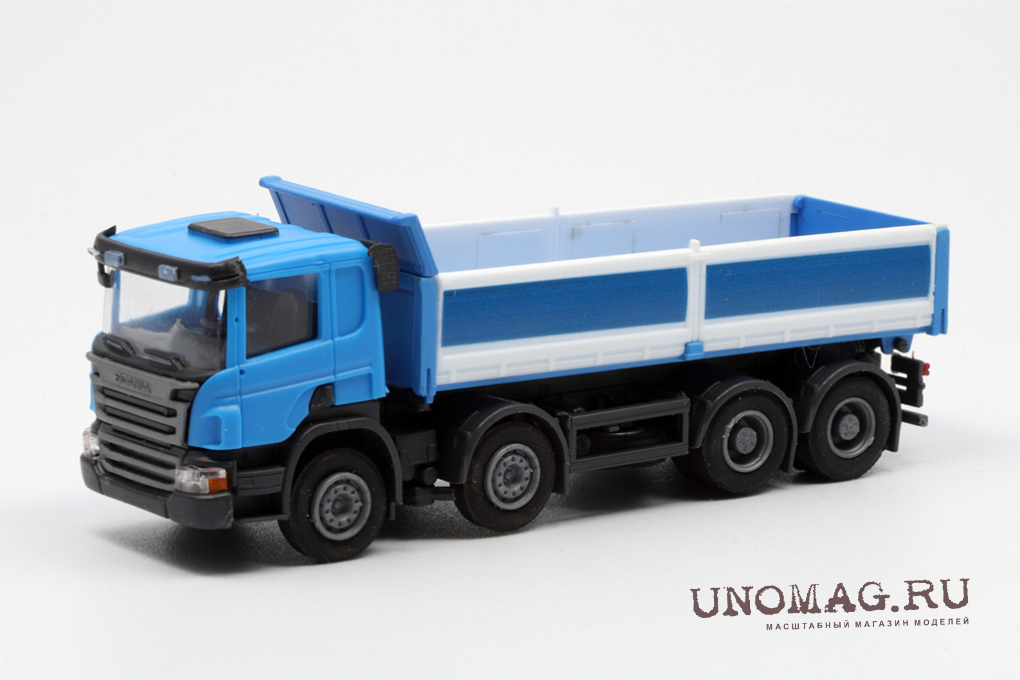 SCANIA P 8х4 самосвал с стальными бортами, голубой/белый с голубым