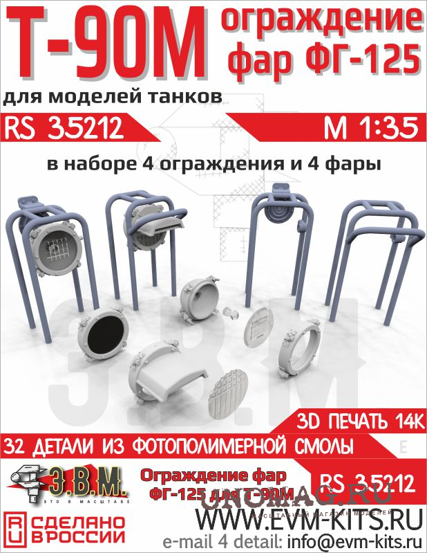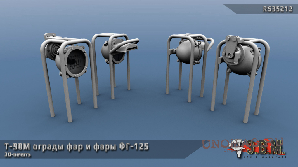 В комплекте защитное ограждение фар и сами фары ФГ-125 для моделей танка Т-90М.