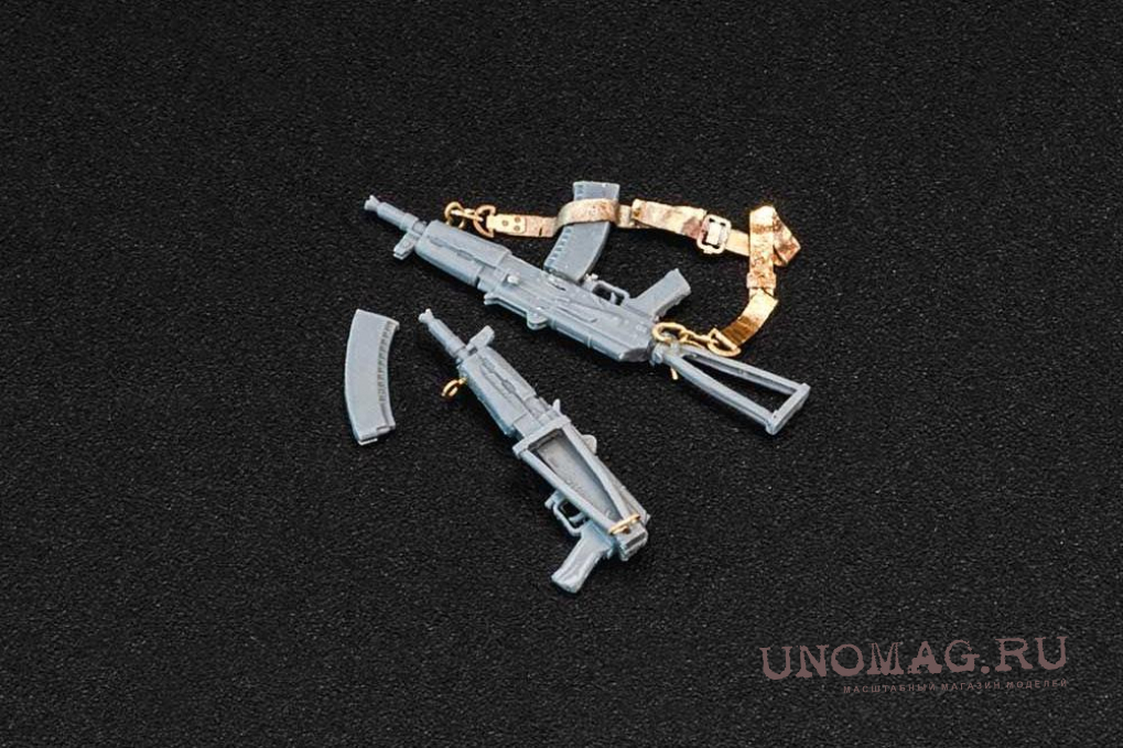 Набор включает в себя 5 выполненных из полиуретановой смолы моделей автоматов с магазинами и с двумя вариантами сборки: с подствольным гранатометом и без, а так же плату фототравления с антабками и ремнями и переводчиками огня.