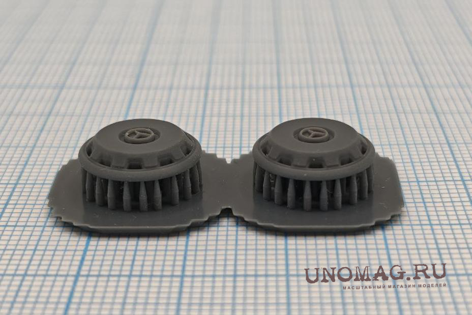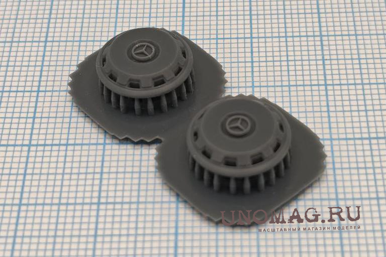 • Описание Комплект колпаков для грузовых автомобилей в масштабе 1/43. Перед установкой требуется окраска изделия. Для удобства окраски детали поставляются на поддержках