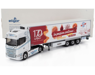 1:43 SCANIA R730 V8 Truck Pianale Trasporto Ruspa Gommata Scraper (2011), White Orange