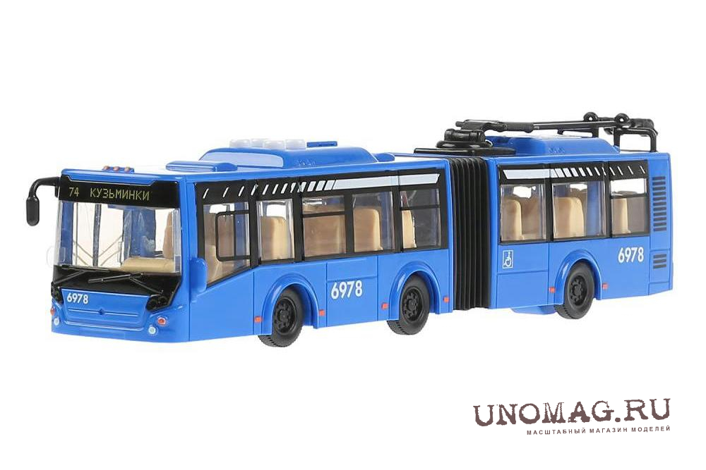 • Описание Инерционная пластиковая модель сочленённого троллейбуса синего цвета от "Технопарк" выполнена похожей на настоящий троллейбус ЛиАЗ.