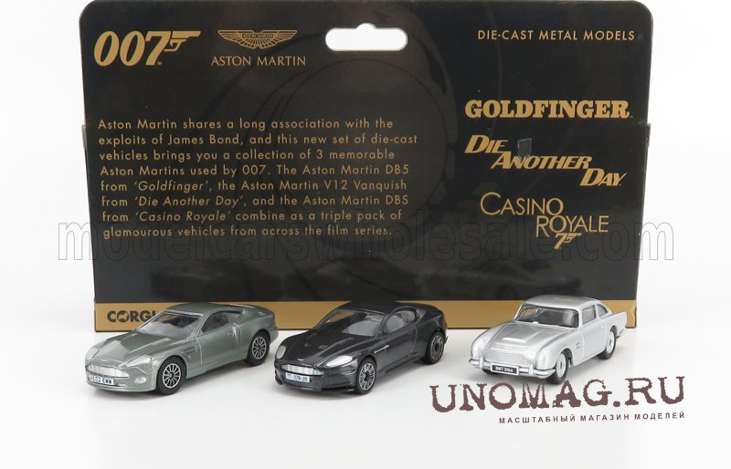 ASTON MARTIN Set 3x 007 James Bond - Db5 1965 Goldfinger - V12 Vanquish Die Another Day La Morte Puo' Attendere - Dbs 2008 Casino Royale, Grey Silver